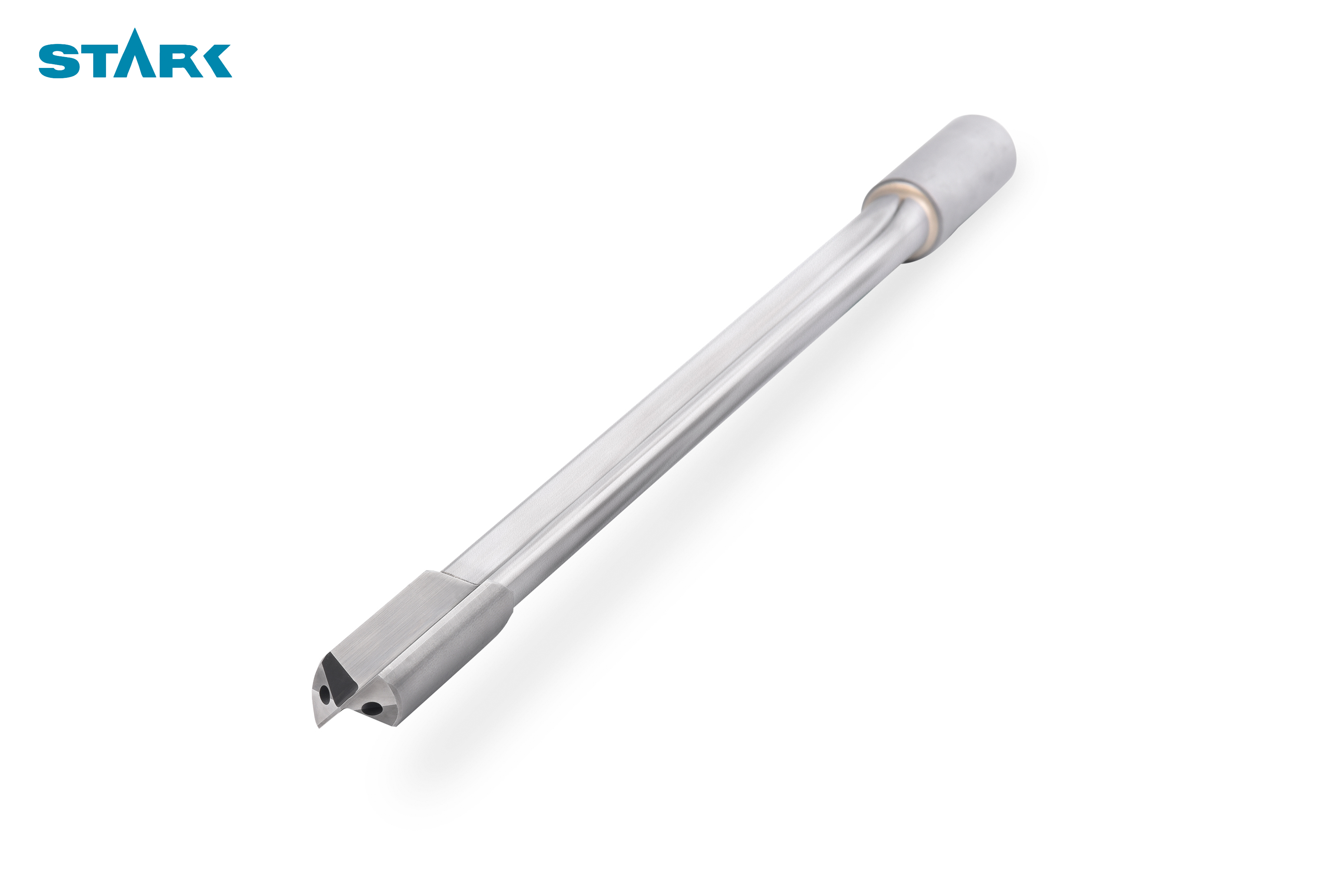 焊接式双刃枪钻有两个对称的切削刃,与单刃枪钻有着相同的切削液循环系统,切削液有刀头上的两个进油孔供入切削刃部,切削液和切削的混合物由刀杆外部的排屑槽排除。双刃枪钻是由钻尖、钻杆、钻柄三部分通过焊接成为一个整体,也可以为全整体硬质合金制作而成。但由于双刃钻的排屑空间有限,因此它适用于加工易断屑材料。